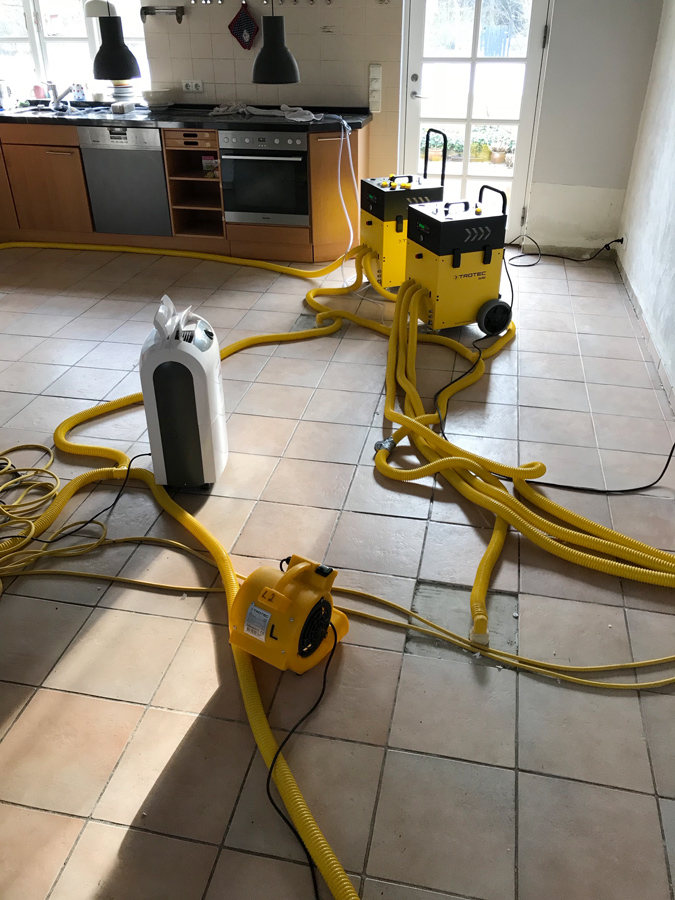 Die Firma kümmerte sich sofort um alle anstehenden Arbeiten. Es begann mit den notwendigen Kontakten zur Versicherung, dem Aushandeln von günstigen Konditionen, Bereit- und Aufstellen der Trocknungsmaschinen, der kontinuierlichen Überwachung des Trocknungsvorgangs und aller weiteren nun folgenden Handwerksarbeiten.
